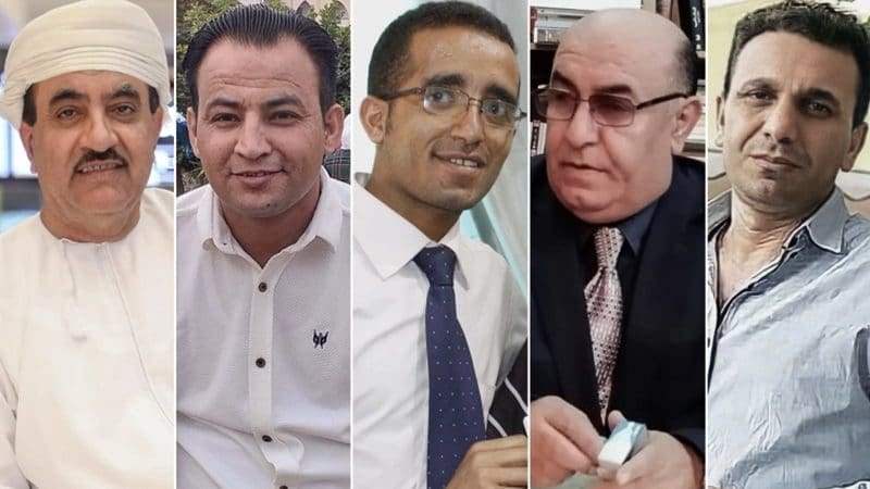 من اليمين الشاعر الفلسطيني عصري مفارجة، ثم الناقد والأكاديمي الأردني عاطف الدرابسة، والشاعر اليمني محمد سلطان اليوسفي، فمواطنه الأكاديمي علوي الملجمي، ثم الشاعر والمسرحي عبدالرزاق الربيعي