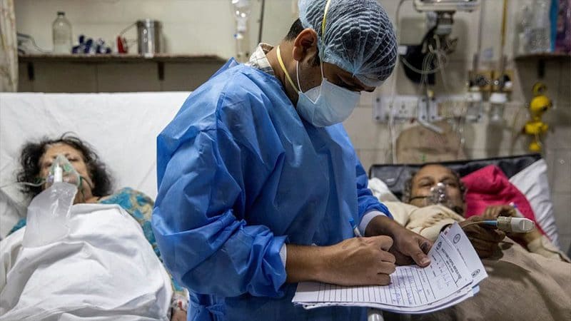 مصابون بكورونا يتلقون الأكسجين في أحد مستشفيات نيودلهي.