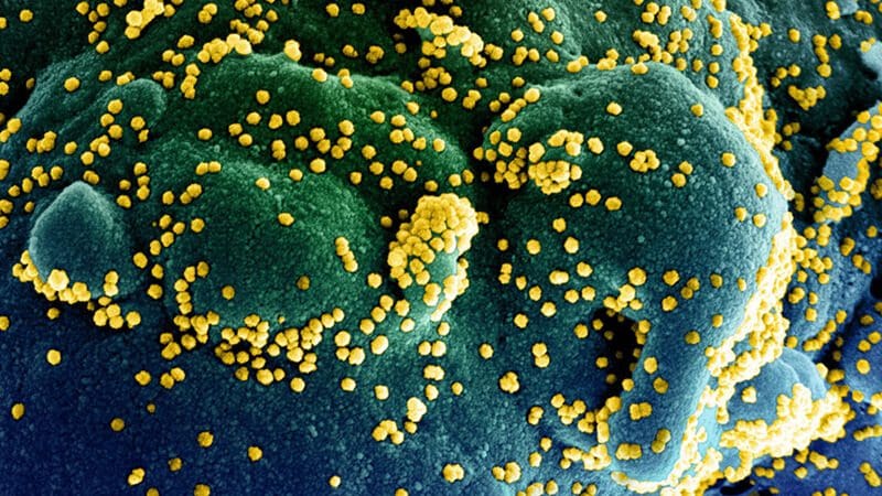 فيروسات كورونا (بالأصفر) تحيط إحدى الخلايا البشرية