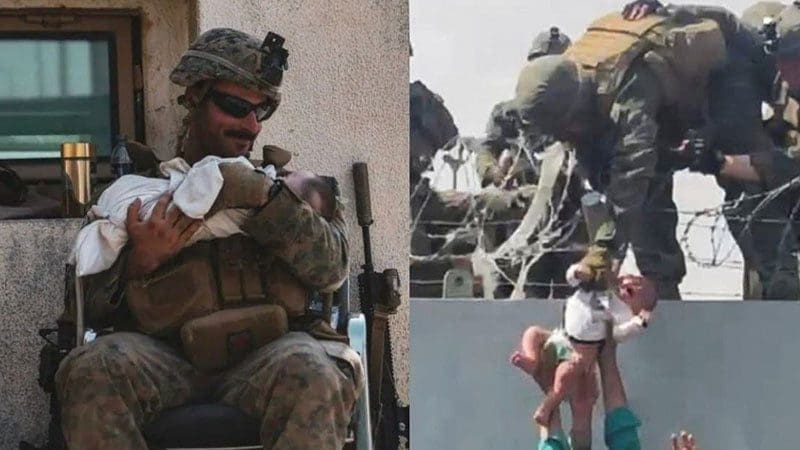 الرضيع مع أحد عناصر مشاة البحرية الأميركية