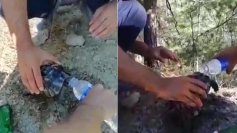 رجال إطفاء.. يرشون بالماء سلحفاة أنقذوها من حرائق الغابات