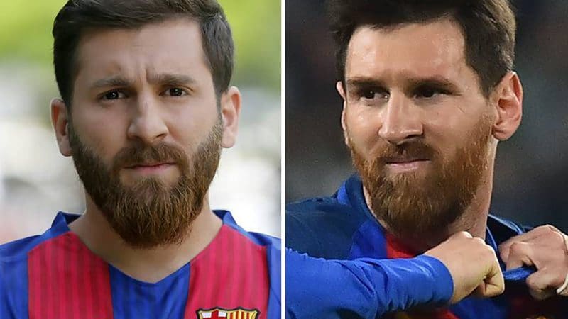 لاعب كرة القدم لنادي برشلونة، ليونيل ميسي وشبيهه من أفغانستان رضا باراستيه، 2017
