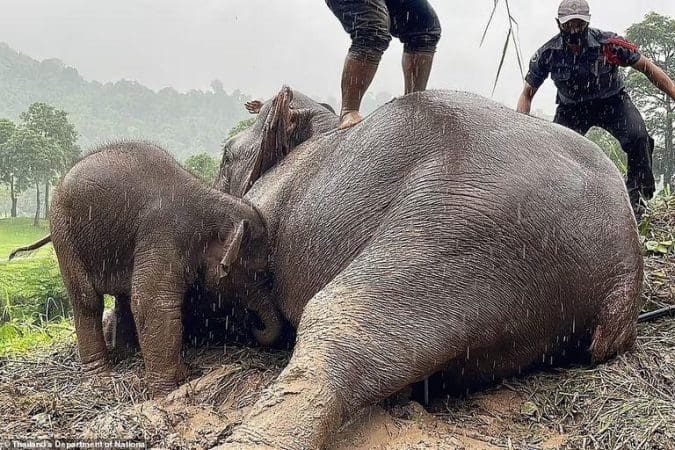 عملية إنقاذ مثيرة لأنثى فيل وصغيرها بتايلاند بعد أن سقطا في حفرة