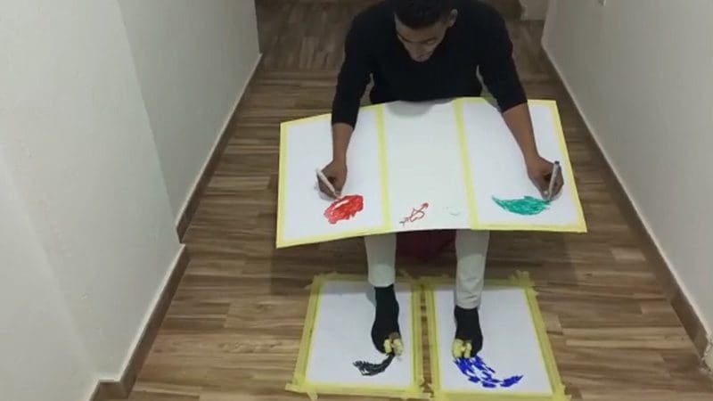 رسام يستخدم يديه وقدميه لرسم “4” لوحات مختلفة في آن واحد