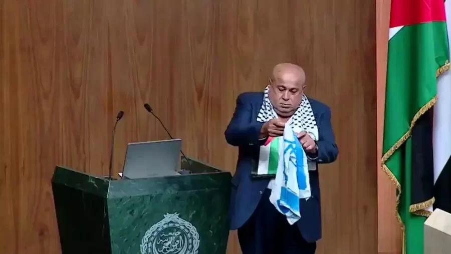 شاهد: نائب برلماني يحرق علم إسرائيل في قاعة الجامعة العربية