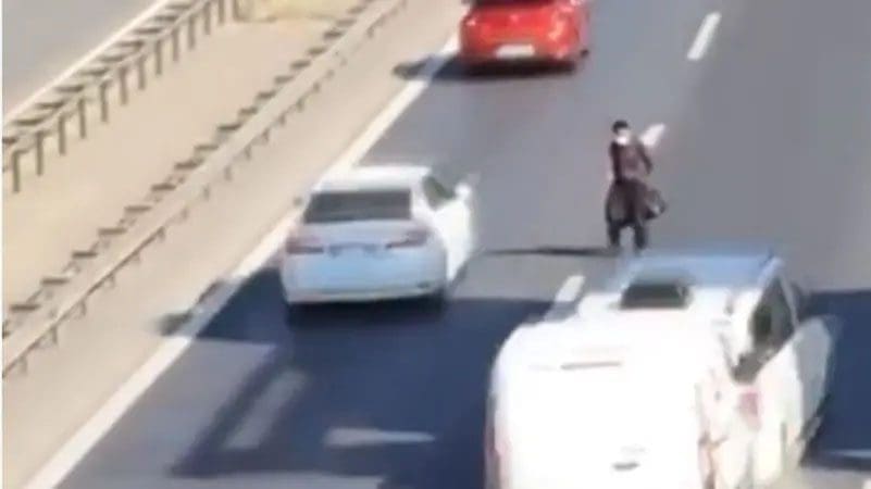 فيديو يحبس الأنفاس.. رجل يتخطى الطريق السريع بطريقة غريبة!