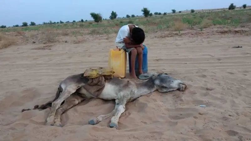 طفل يبكي بجانب حمار نفق عطشًا.. صورة تخطف القلوب