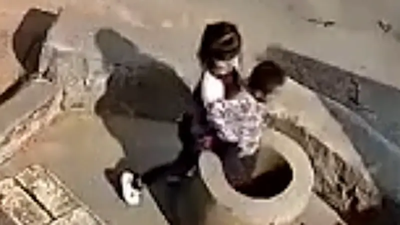 فيديو رهيب.. طفلة تتسلى بإلقاء صغير ببئر عميقة