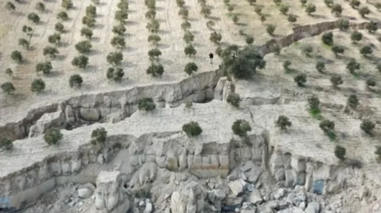 شاهد: طائرة مسيّرة ترصد انشطار حقل زيتون بسبب الزلزال