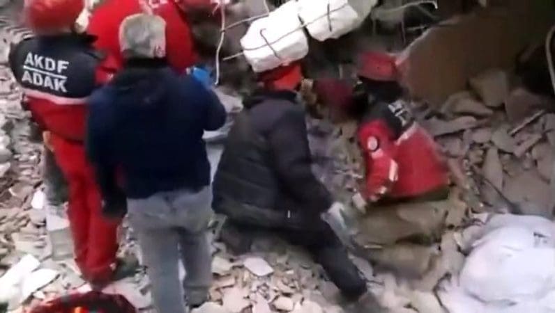 شاهد لحظة انهيار مبنى تحت الأنقاض على فريق إنقاذ في تركيا