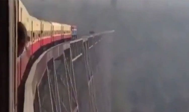 فيديو يحبس الأنفاس.. قطار يسير على سكة مرتفعة عن الأرض