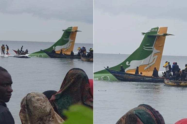 طائرة تغرق في بحيرة بعد فشلها بالهبوط بمطار تنزانيا “فيديو”