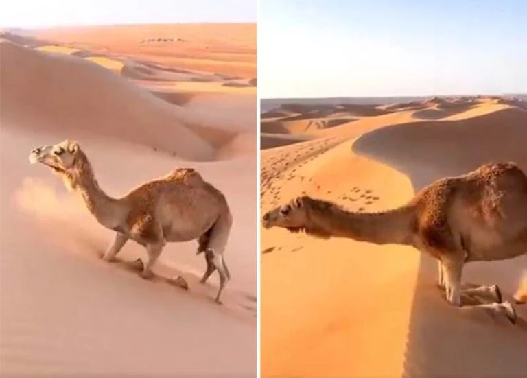شاهد.. كيف تعبر الجمال الكثبان الرملية في الصحراء