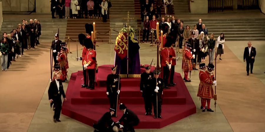 شاهد: سقوط حارس نعش الملكة إليزابيث الثانية مغشيًا عليه “فيديو”