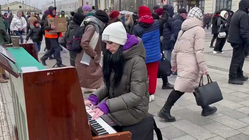 فتاة أوكرانية تعزف البيانو أمام محطة قطار