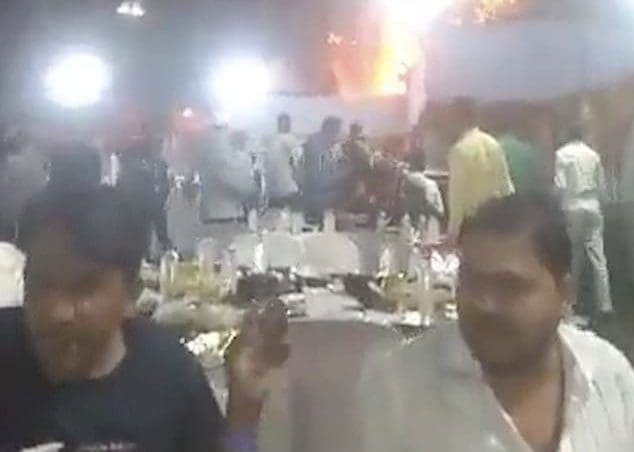 رجلان يستمران في تناول الطعام رغم اندلاع حريق هائل خلفهم