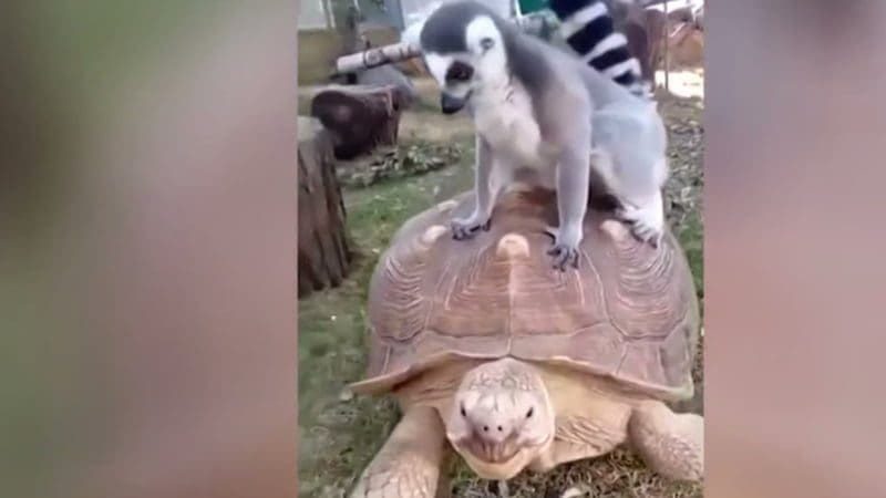ليمور.. يعتلي ظهر سلحفاة في حديقة حيوانات