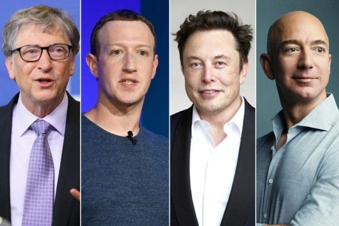 من اليمين: جيف بيزوس مؤسس "أمازون"، وإيلون ماسك الرئيس التنفيذي لشركة "تسلا"، ومارك زوكربيرغ مؤسس "فيسبوك"، وبيل غيتس مؤسس "مايكروسوفت" (مواقع التواصل)