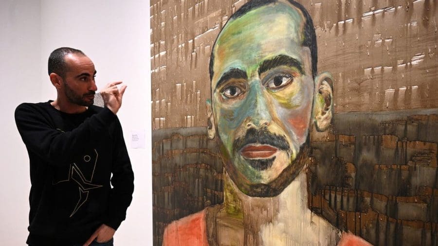 مصطفى عظيميتبار أمام اللوحة التي رسمها