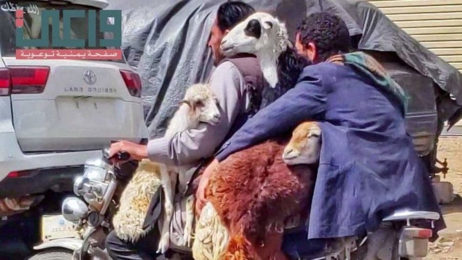 مشاهد طريفة.. حمولة زائدة و “6” خراف على دراجة نارية مع سقوط واحدة منها