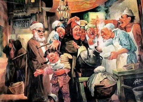 نفس الحال في لوحته “بائع الفول” التي يظهر فيها جمع من الناس حول عربة فول وزينة رمضان والفوانيس معلقة فوقهم في أجواء رمضانية مصرية واقعية.
