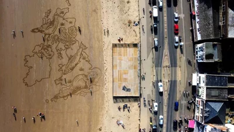 منظر جوي لرسم رملي ضخم على شاطئ ساوث باي، أنشأه فريق “ساند إن يور آيز” (Sand in Your Eyes) لتسليط الضوء على قلق الشباب من فقدان الحياة البرية، في سكاربورو، بريطانيا، 23 مارس 2022.
