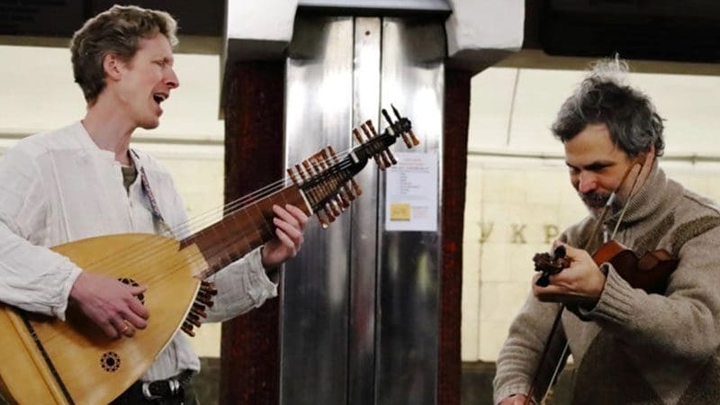 فيدينسكيج (يسار) يغني للأمل في شوارع وملاجئ العاصمة الأوكرانية كييف