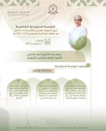 يعقد مجلس الشورى العماني بعد غدٍ الأربعاء الجلسة الاعتيادية الخامسة، لمناقشة اتفاقية الشراكة الاقتصادية الشاملة بين سلطنة عُمان وجمهورية الهند.