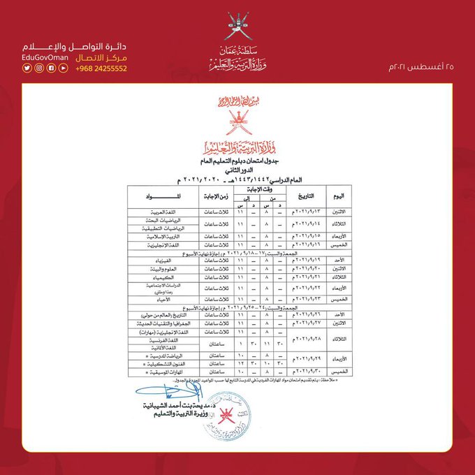 وشمل أيضا جداول امتحانات كل من المدارس الخاصة (ثنائية اللغة) ودبلوم التعليم العام التقني لكلية الحرس السلطاني العماني التقنية ثنائية اللغة و(التربية الخاصة) ودبلوم التعليم العام والعلوم الإسلامية بالإضافة إلى مدرسة الأوركسترا السيمفونية السلطانية العمانية ، ومدرسة أوركسترا مسقط الفلهارمونية في الحرس السلطاني العماني ( دراسات موسيقية – ثنائية اللغة).