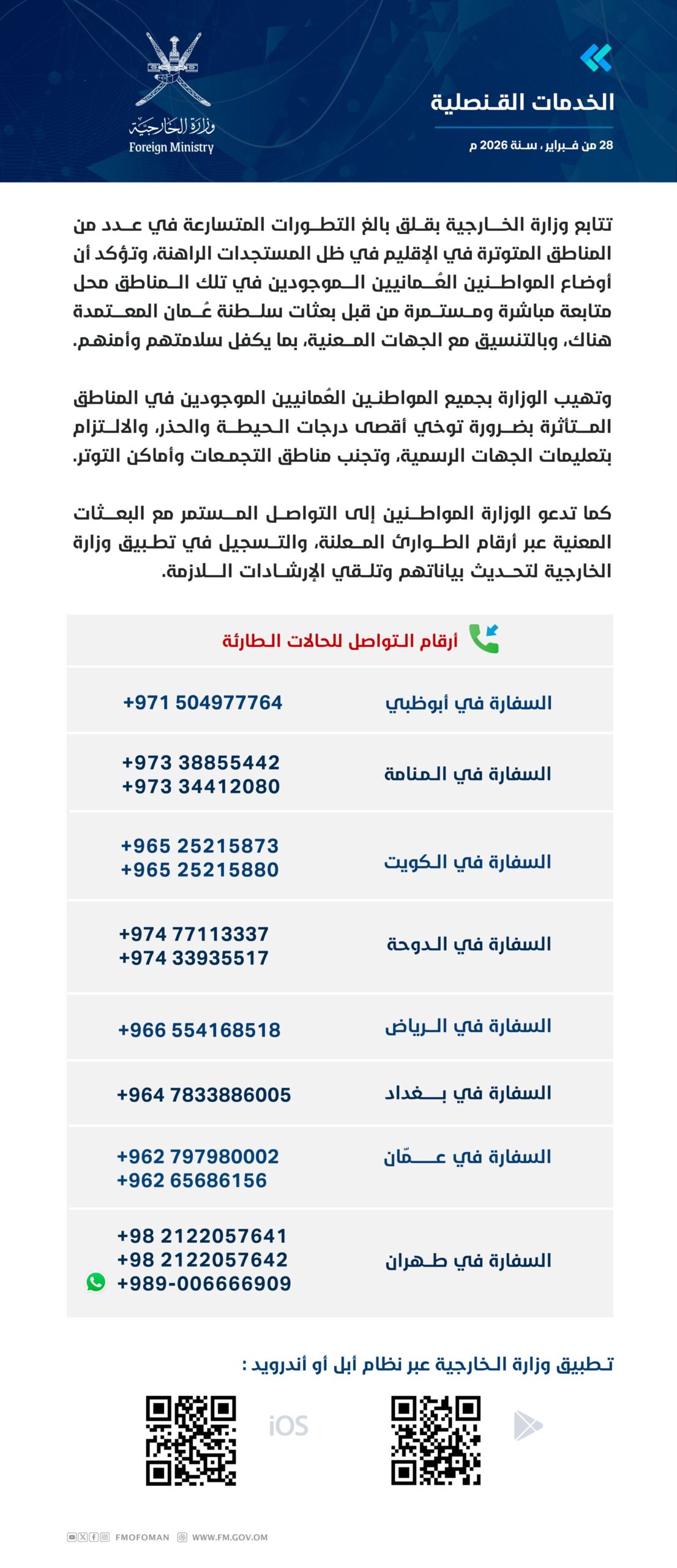 كما دعت الوزارة المواطنين إلى التواصل المستمر مع البعثات المعنية عبر أرقام الطوارئ المعلنة، والتسجيل في تطبيق وزارة الخارجية لتحديث بياناتهم وتلقي الإرشادات اللازمة.