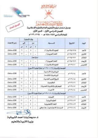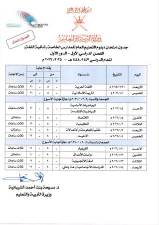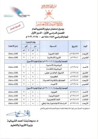 أعلنت وزارة التربية والتعليم عن تعديل جدول امتحانات الدبلوم العام، وذلك بعد صدور قرار رسمي بتحديد الإجازات الرسمية والدينية في سلطنة عمان خلال عام 2026.