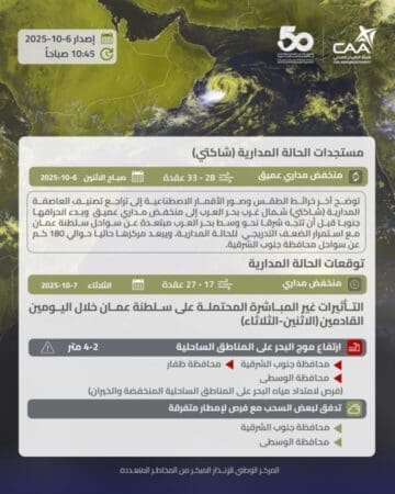 وبدء انحرافها جنوبا قبل أن تتجه شرقا نحو وسط بحر العرب مبتعدة عن سواحل سلطنة عمان مع استمرار الضعف التدريجي للحالة المدارية، ويبعد مركزها حاليا حوالي 180 كم عن سواحل محافظة جنوب الشرقية.