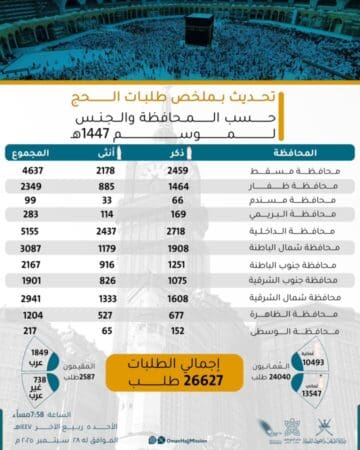 بلغ إجمالي طلبات الحج لموسم 1447هـ (26627) طلبًا من مختلف محافظات سلطنة عمان، وذلك بحسب ما أعلنته بعثة الحج العُمانية في تحديثها الأخير لملخص الطلبات.