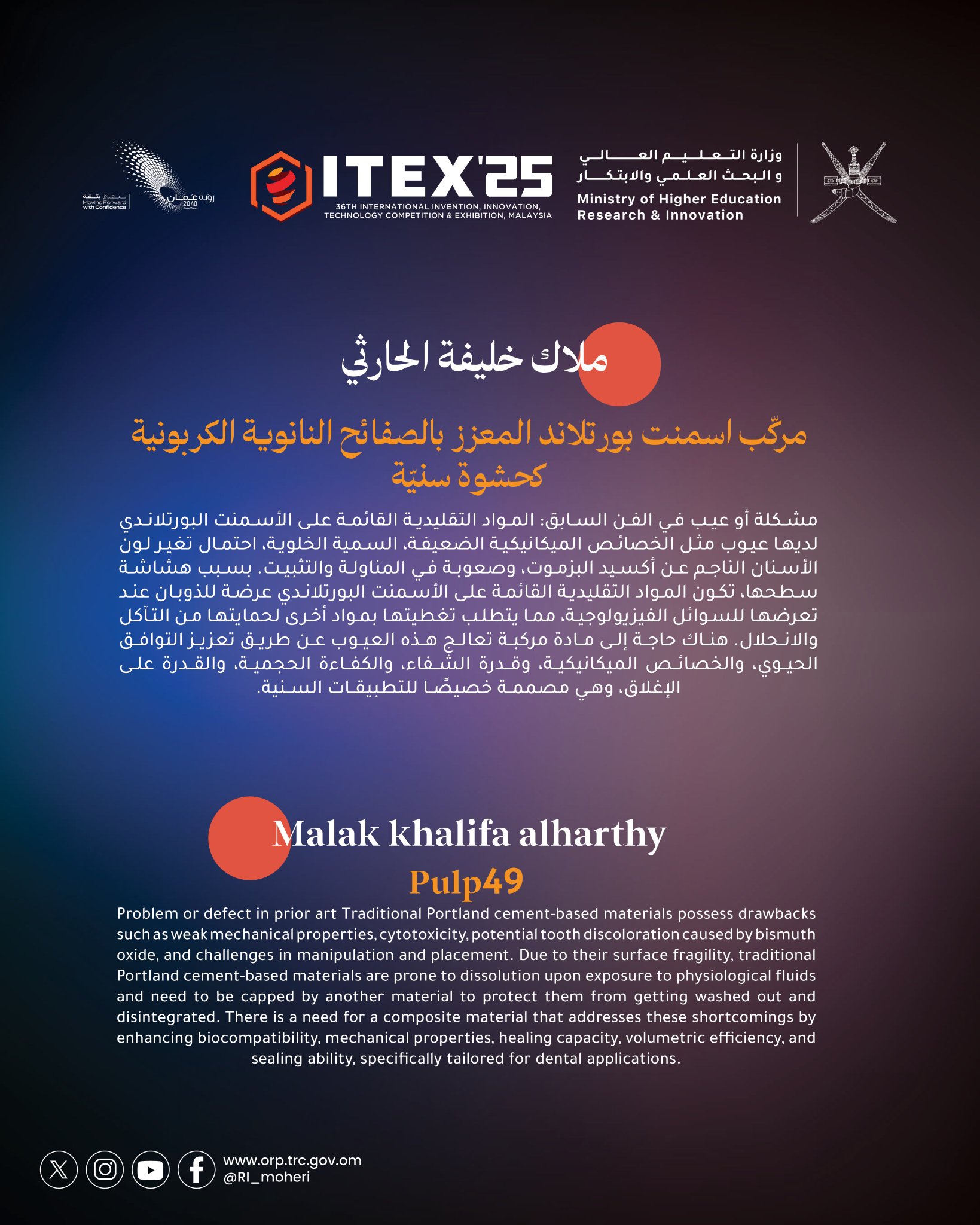 وقالت ملاك بنت خليفة الحارثية، عضو الفريق البحثي “Pulp49″، لوكالة الأنباء العُمانية إن فكرة الابتكار انطلقت من ملاحظة أنّ الحشوات التقليدية غالبًا ما تفتقر إلى الجمع بين “القوة” و “التوافق الحيوي”، وهو ما دفع الفريق إلى ابتكار مركب جديد يُحقق هذه المعادلة الصعبة.