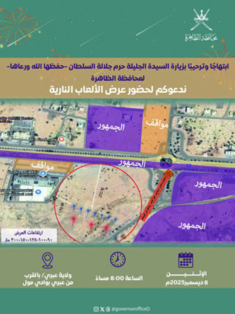 دعت محافظة الظاهرة المواطنين لحضور عرض الألعاب النارية الذي سيقام بولاية عبري اليوم الإثنين الموافق 8 ديسمبر 2025م الساعة 8 مساءً بالقرب من عبري بوادي مول.