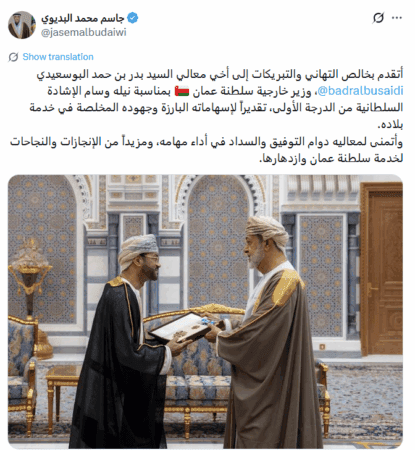 تقدم معالي جاسم محمد البديوي الأمين العام لمجلس التعاون الخليجي بخالص التهاني والتبريكات إلى معالي السيد بدر بن حمد البوسعيدي، وزير خارجية سلطنة عمان بمناسبة نيله وسام الإشادة السلطانية من الدرجة الأولى، تقديراً لإسهاماته البارزة وجهوده المخلصة في خدمة بلاده.