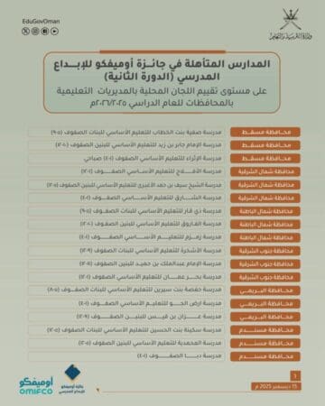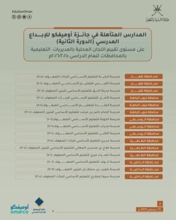 أعلنت وزارة التربية والتعليم عن المدارس المتأهلة في جائزة أوميفكو للإبداع المدرسي (الدورة الثانية) على مستوى تقييم اللجان المحلية بالمديريات التعليمية بالمحافظات للعام الدراسي ٢٠٢٦/٢٠٢٥م.