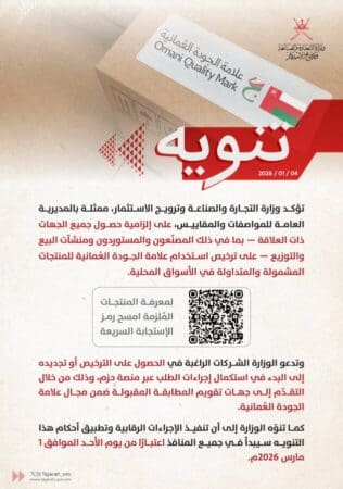 أكدت وزارة التجارة والصناعة وترويج الاستثمار، ممثلة بالمديرية العامة للمواصفات والمقاييس، على إلزامية حصول جميع الجهات ذات العلاقة – بما في ذلك المصنّعون والمستوردون ومنشآت البيع والتوزيع – على ترخيص استخدام علامة الجودة العُمانية للمنتجات المشمولة والمتداولة في الأسواق المحلية.