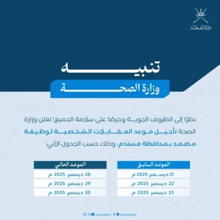 أعلنت وزارة الصحة عن تأجـيـل مــوعد المــقـابــلات الـشـخـصـيـة لـوظـيـفـة مـضـمـد بـمـحافظة مـسندم، وذلك نظراً للظروف الجوية وحرصاً على سلامة الجميع.