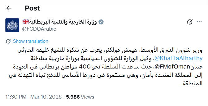 أعرب وزير شؤون الشرق الأوسط البريطاني، هيمش فولكنر، عن شكره للشيخ خليفة الحارثي، وكيل وزارة الخارجية العمانية للشؤون السياسية، لمساعدة سلطنة عمان في إجلاء حوالي 400 مواطن بريطاني بأمان، مثمناً دور السلطنة في التهدئة.