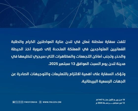 نبهت سفارة سلطنة عُمان في لندن المواطنين والطلبة العُمانيين المتواجدين في المملكة المتحدة إلى ضرورة أخذ الحيطة والحذر، وتجنب أماكن التجمعات والمظاهرات التي سيجري تنظيمها في مدينة لندن يوم السبت الموافق 13 سبتمبر 2025.