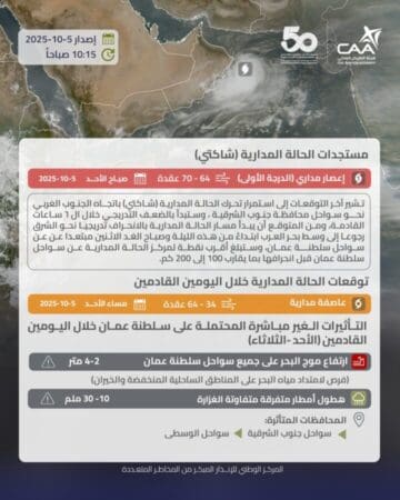 تشير آخر توقعات هيئة الطيران المدني إلى استمرار تجرك الحالة المدارية ( شاكتي) باتجاه الجنوب الغربي نحو سواحل محافظة جنوب الشرقية، وستبدأ بالضعف التدريجي خلال الــ 6 ساعات القادمة.