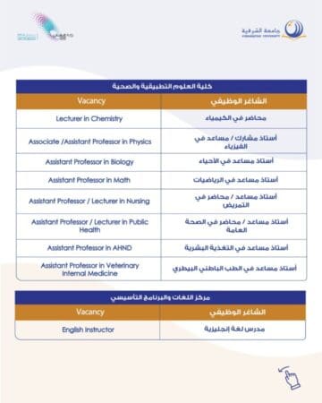 جامعة الشرقية تعلن عن توفر شواغر وظيفيةالخميس,22 يناير , 2026 2:01مسلطنة عمانجامعة الشرقية تعلن عن توفر شواغر وظيفية