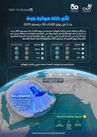 تتوقع الأرصاد العمانية تأثر سلطنة عمان بكتلة هوائية باردة، اعتبارًا من يوم غدٍ الثلاثاء 30 ديسمبر 2025 حيث تبدأ درجات الحرارة بالانخفاض الملحوظ على معظم محافظات سلطنة عمان مع مع اشتداد في نشاط الرياح.