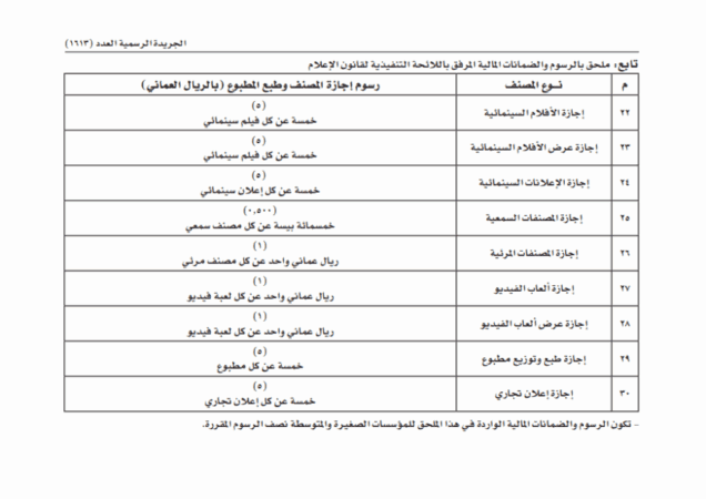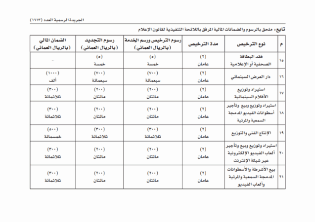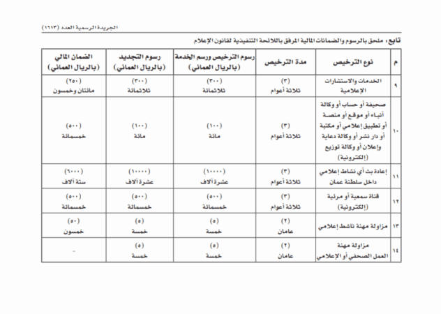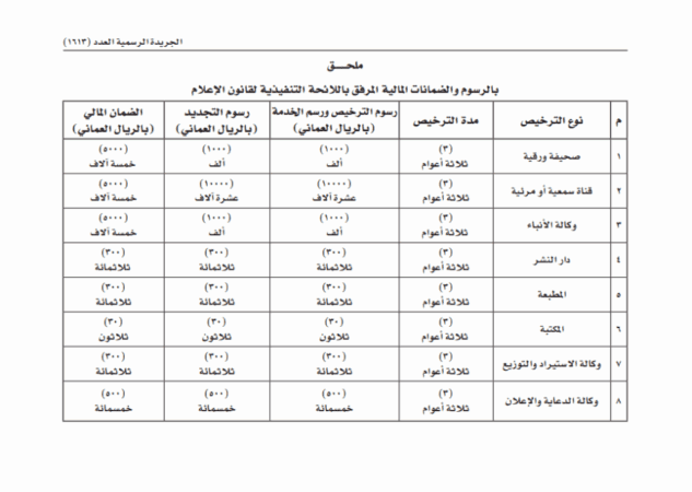 وحددت اللائحة رسوم مزاولة النشاط الإعلامي في سلطنة عمان: