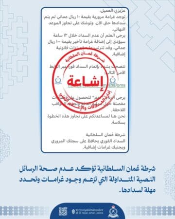 نفت شرطة عُمان السلطانية صحة الرسائل النصية المتداولة التي تزعم وجود غرامات وتحدد مهلة لسدادها.