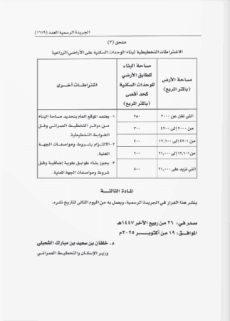 يستبدل بالملحق (1) “الاشتراطات التخطيطية لضوابط تجزئة الأراضي” المرفق باللائحة التنظيمية لضوابط تخطيط الأراضي المشار إليها، الملحق الآتي: