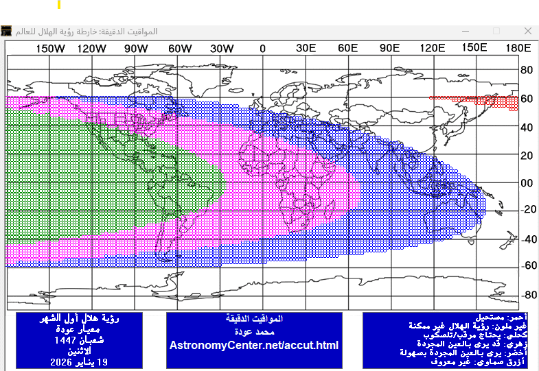 - الخارطة المرفقة تبين مدى إمكانية رؤية الهلال يوم الإثنين 19 يناير من جميع مناطق العالم، بحيث أن: