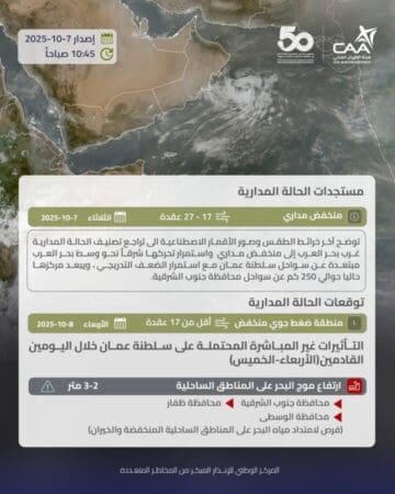 توضح آخر خرائط الطقس وصور الأقمار الاصطناعية الى تراجع تصنيف الحالة المدارية غرب بحر العرب إلى منخفض مداري واستمرار تحركها شرقاً نحو وسط بحر العرب مبتعدة عن سواحل سلطنة عمان مع استمرار الضعف التدريجي.