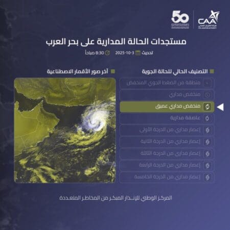 أفادت الأرصاد العمانية بتطور الحالة المدارية في بحر العرب إلى منخفض مداري عميق، مع احتمالية تطورها إلى عاصفة مدارية خلال ال 24 ساعة القادمة مع تحركها إلى وسط بحر العرب ولا يوجد تأثير مباشر على سلطنة عمان خلال ال 3 أيام القادمة .
